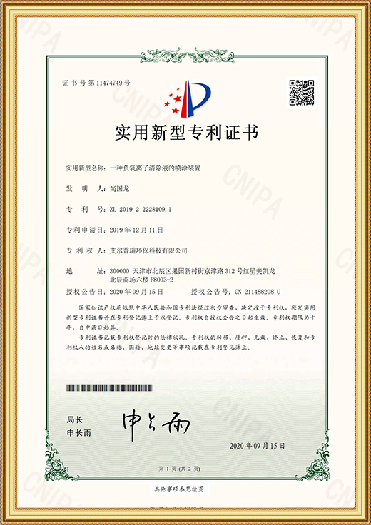 實(shí)用新型專利證書(shū)(一種負(fù)氧離子清除液的噴涂